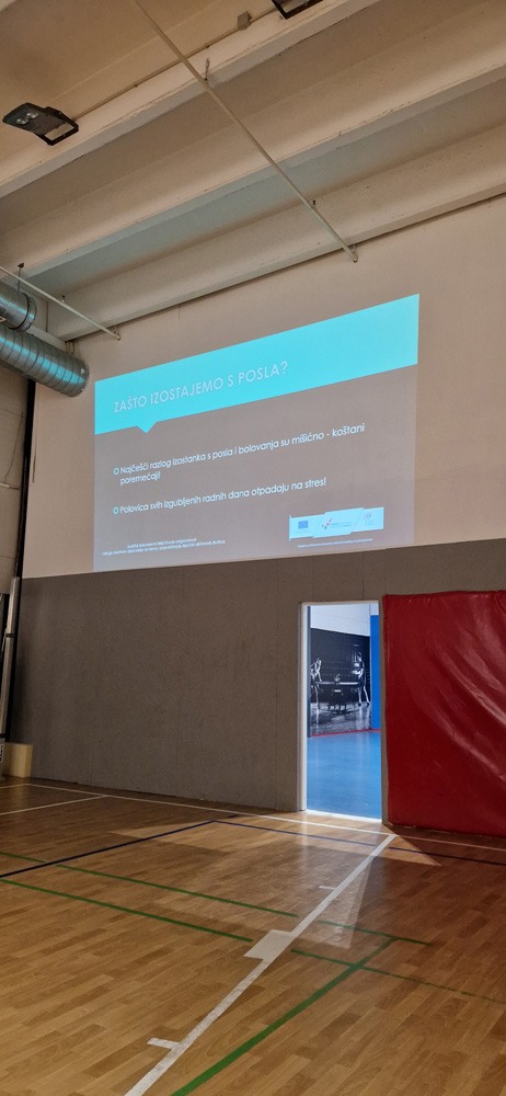 Prvo predavanje održala je Renata Sopek na kojoj se govorilo o važnosti tjelovježbi u svakoj prilici kako bi se smanjio stres i povećalo zdravlje na radnom mjestu, zatim je uslijedio aerobni trening kako bi se podigao puls polaznicima te adekvatno zagrijali tijelo.